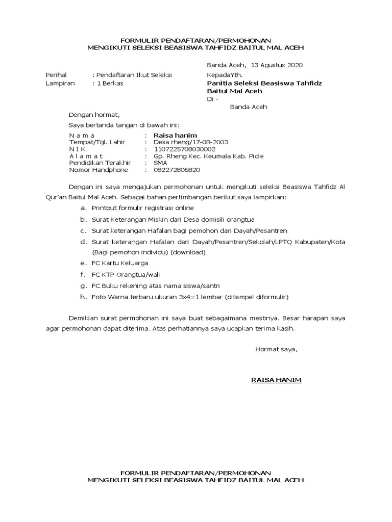 Permohonan Beasiswa Baitul Mal Re Pdf
