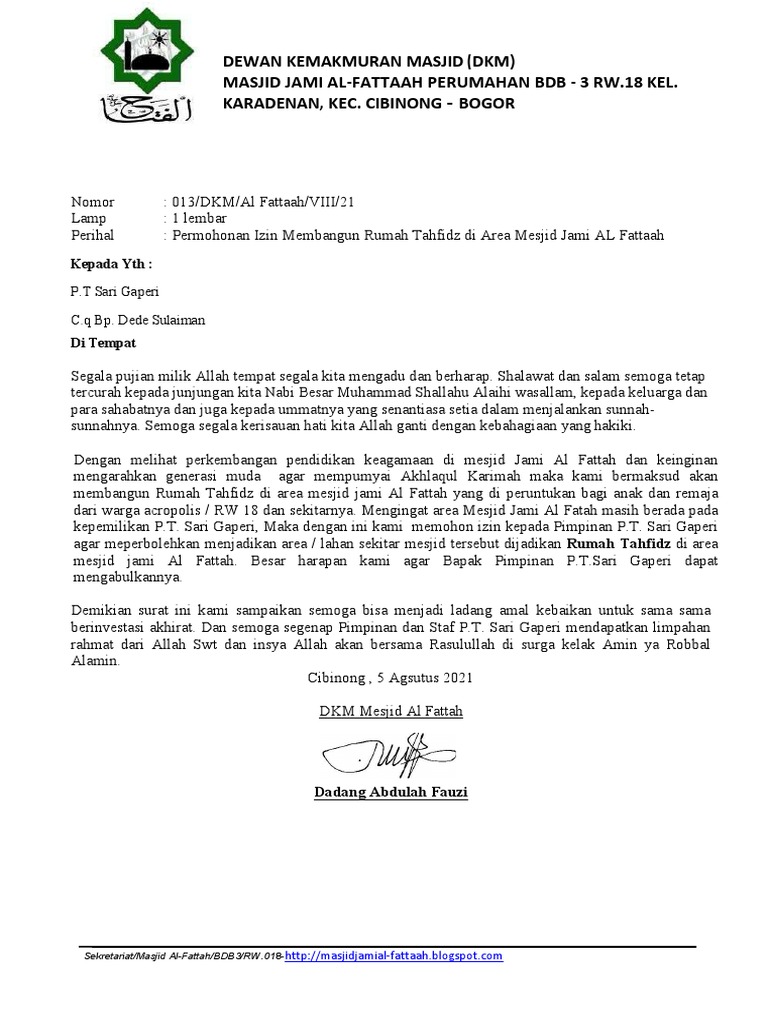 Surat Permohonan Izin Pembanguna Rumah Tahfidz Mesjid Jami Al Fattaah Pdf